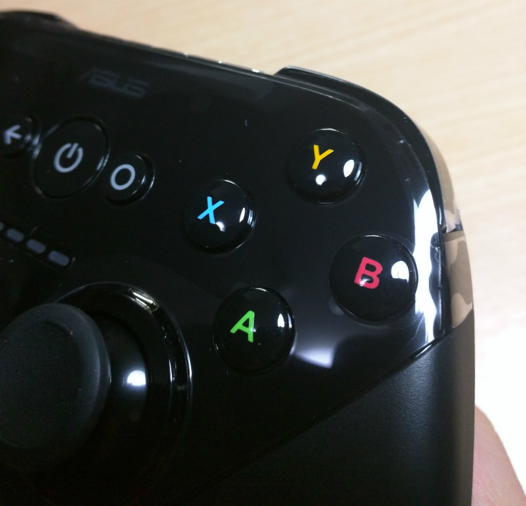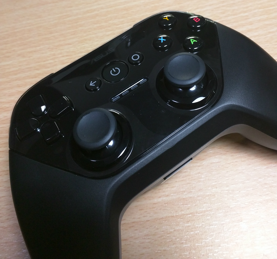 ゲームパッド本体は天板部分が光沢のあるパネルでその他はつや消しのサラサラした手触りになっています。ボタンは通常のゲームパッドのように十字ボタンと4連ボタンとセンターに電源ボタン他の配列になっています。